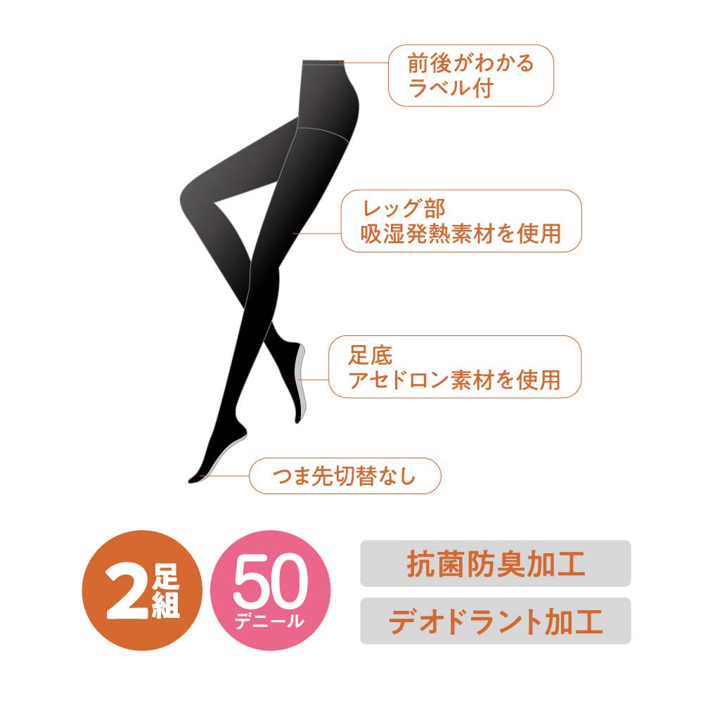 ストッキングとタイツの中間の厚みの50デニール。脚をカバーしつつナチュラルな仕上がりに。レッグ部は、吸湿発熱素材を使用し、薄手でも暖かい。足底の汗対策により、靴の中の汗ムレを軽減します。さらに抗菌防臭加工+消臭加工で、汗やムレが気になる環境でも安心して着用可能。