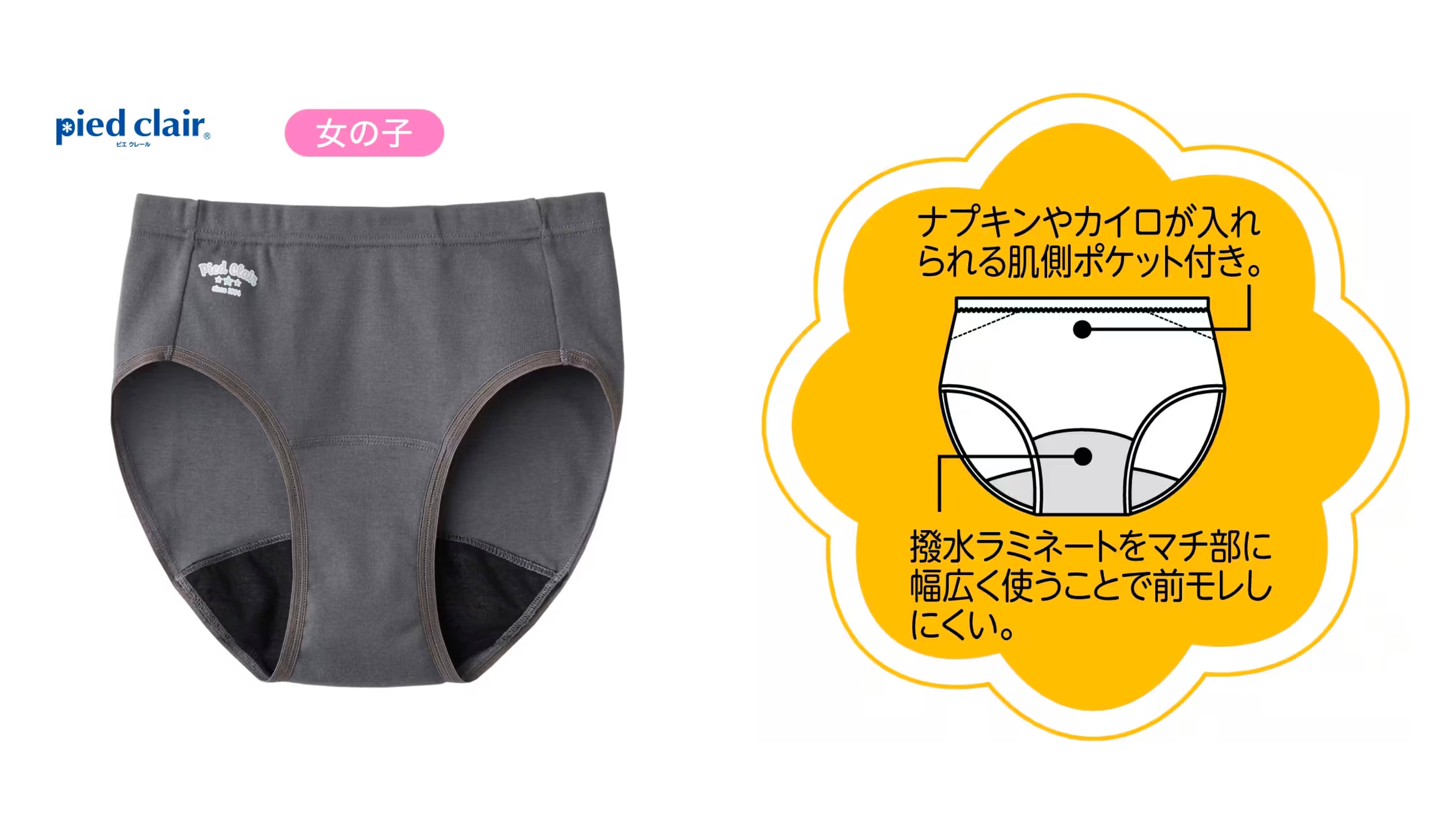 マチの部分に、4層構造の吸収体を備えているジュニア向けの吸水型サニタリーショーツです。