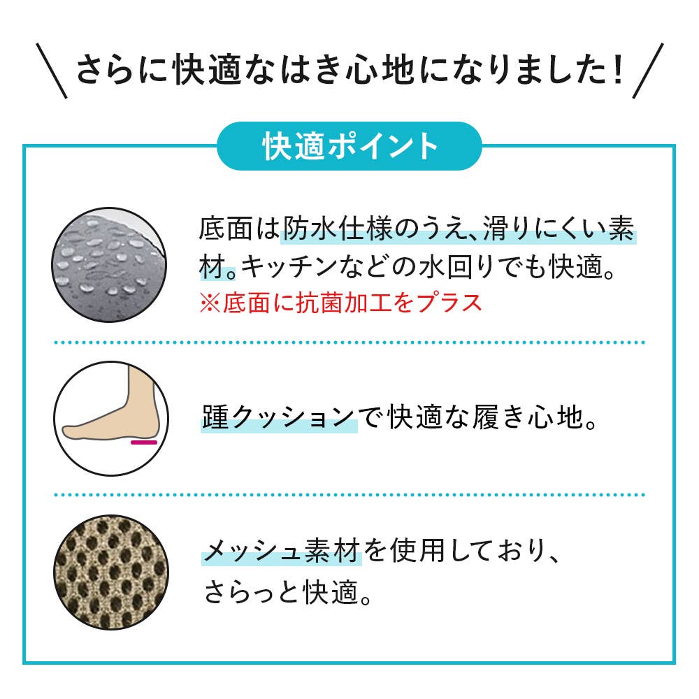 メッシュ素材にすることで、通気性がよく、サラッとムレにくい。かかとは脱げにくいのに、着脱しやすいフィット感のあるストレッチ素材を使用。足底は防水仕様ですべりにくい素材で、キッチンなどの水まわりでの着用も安心。リニューアルでかかとのクッションの密度、反発力を向上。より快適なはき心地に。