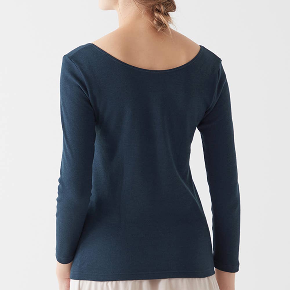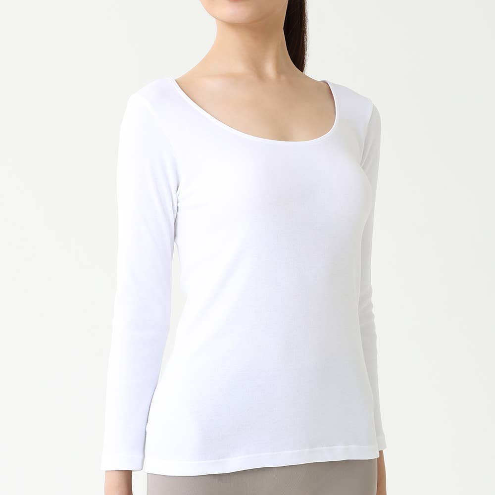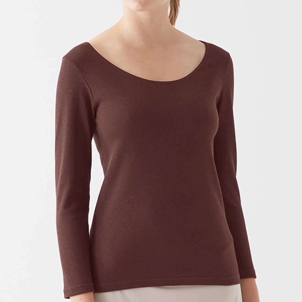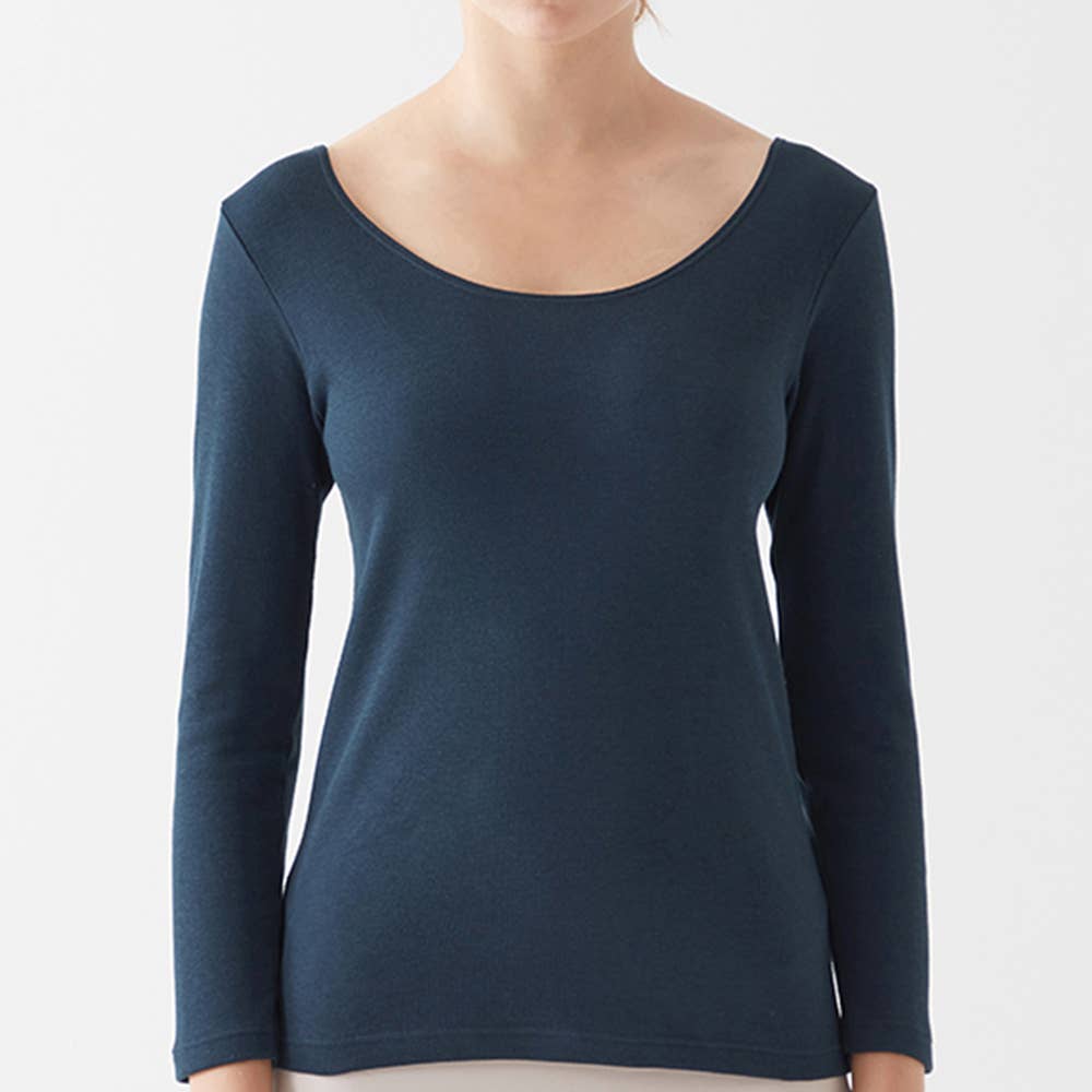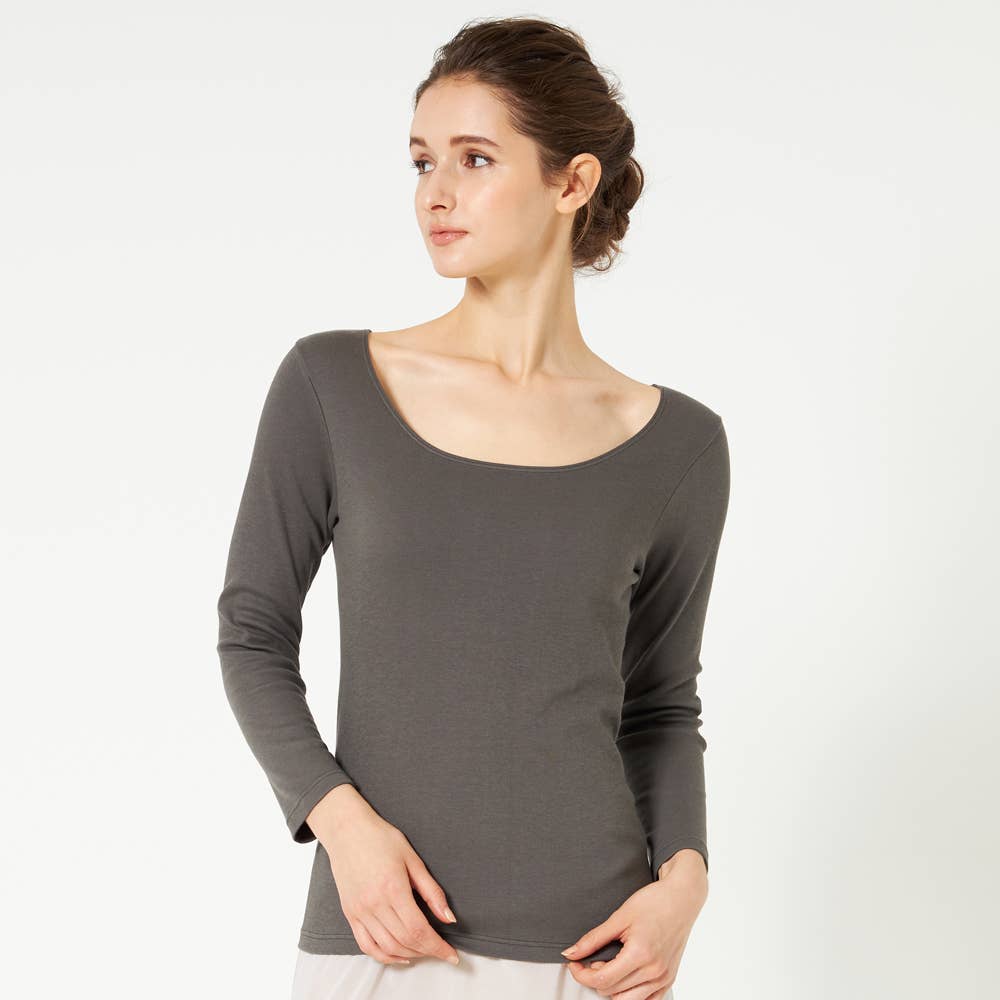 乾燥する季節に嬉しい、保湿加工でやさしい肌触りの綿100%インナー。年間アイテムより厚手で、コットンでも保温性があり暖かく感じます。肌側は毛足の短い微起毛をかけています。着ぶくれしにくい、ちょうどいい起毛感です。