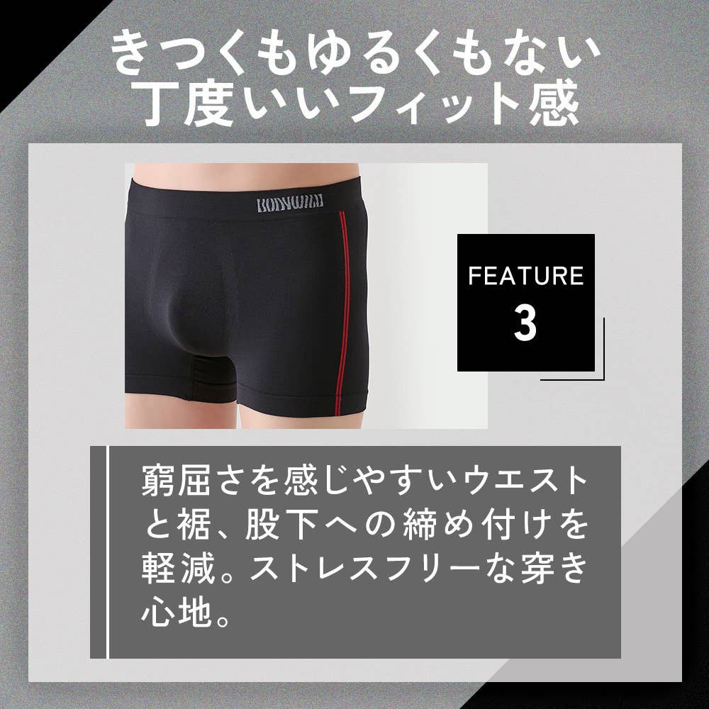 「肌に吸い付くようなフィット感がクセになる!(スタッフM談)」とやみつきになること間違いなしのボクサーパンツです。