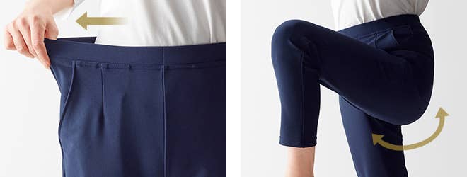 ウエストゴムで楽なのに、前後ウエストにあるダーツにより腰回りはスッキリとしていて脚を美しく見える仕様です。