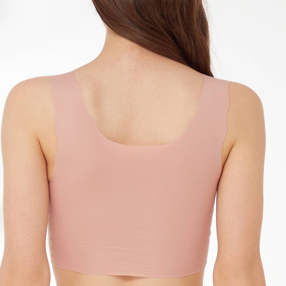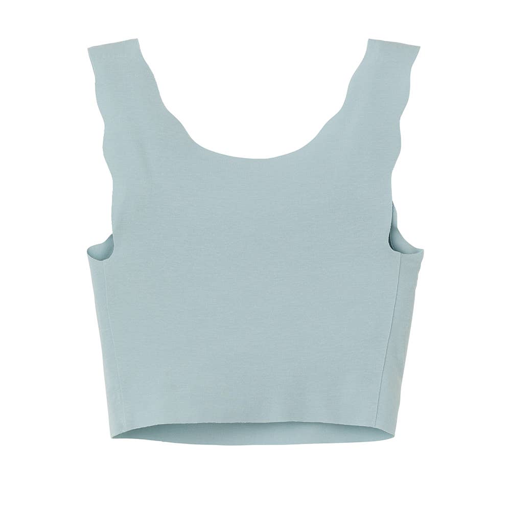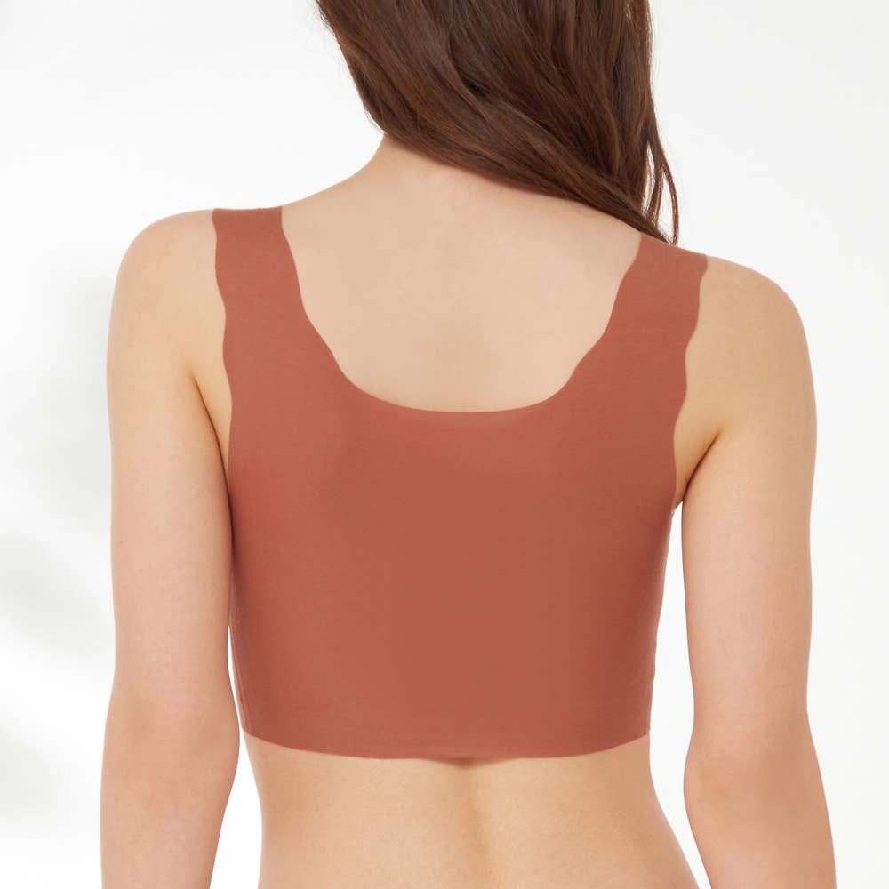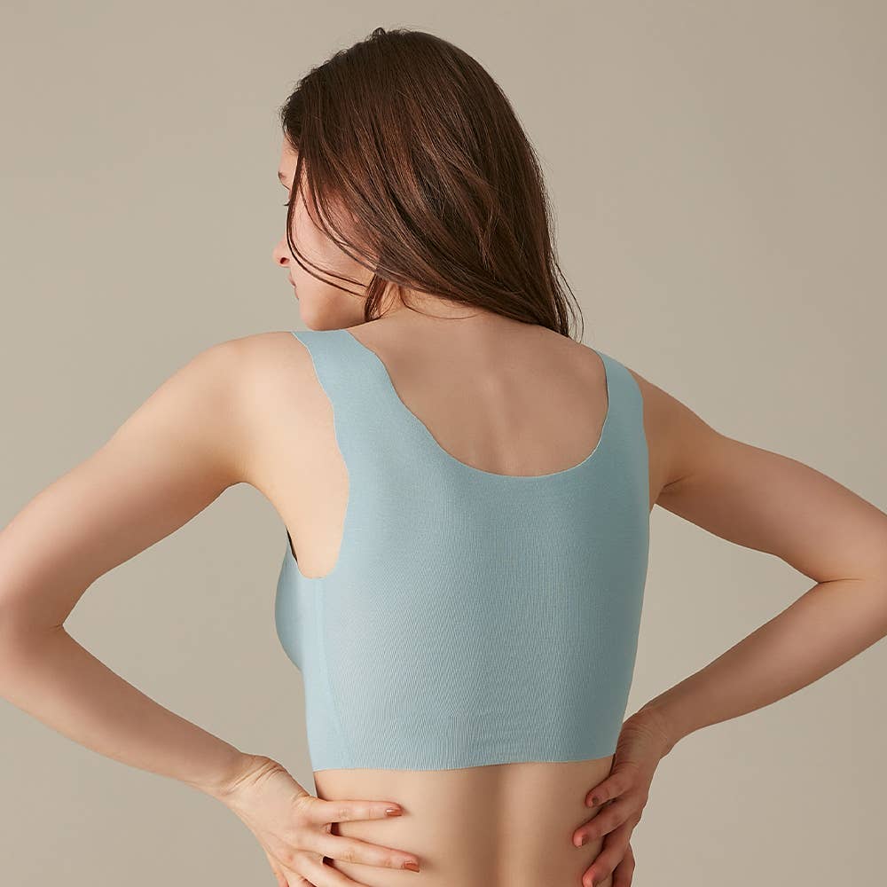 縫い目が無い、肌にやさしいハーフトップです。生地を立体的に加工することで、バストの丸みをつぶさず、バストの丸みをキープします。縫い目が無いので肌への刺激を軽減します。アンダーにはゴムが無く、締め付け感が軽減され、ラクな着用感です。