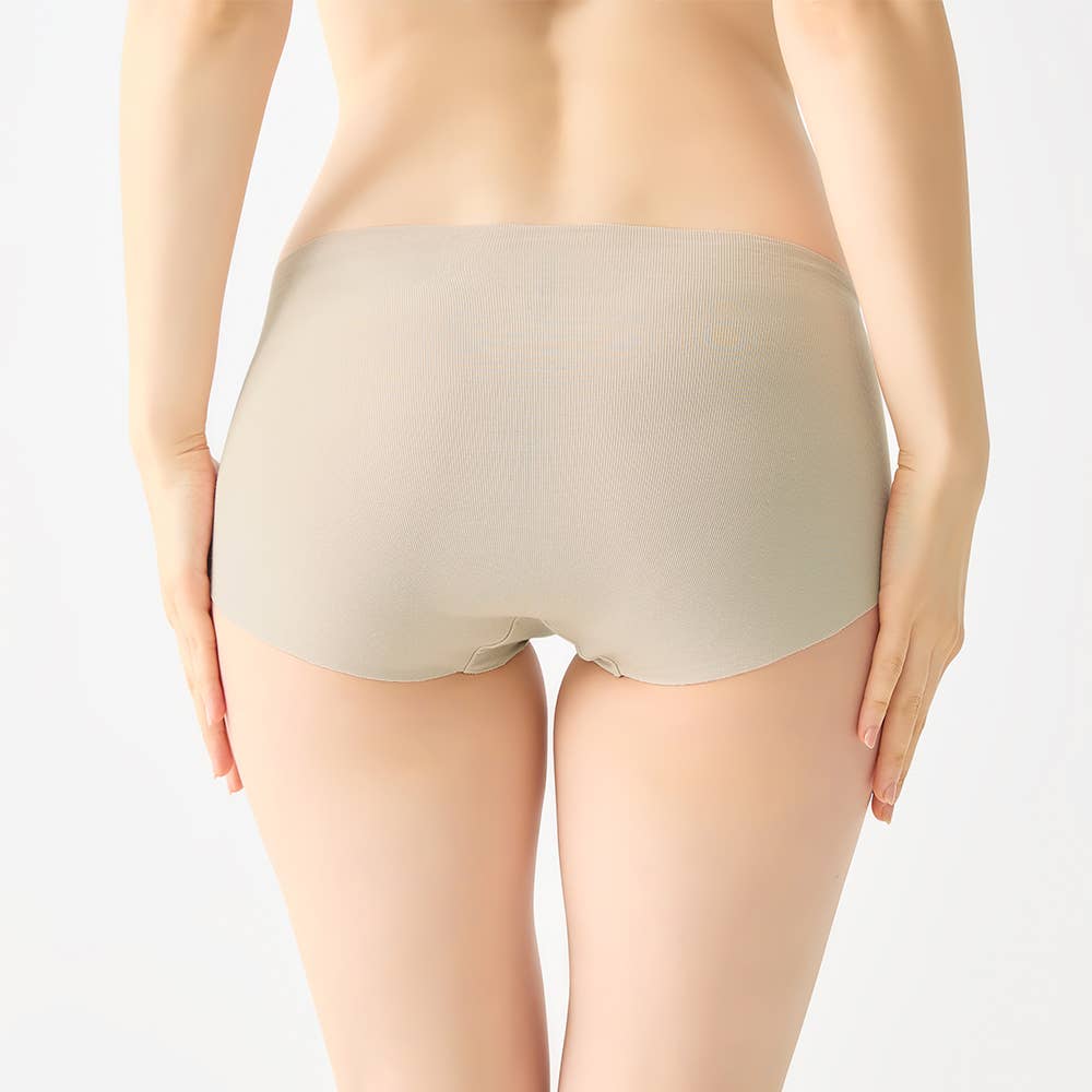 ウエスト、裾にゴムを使用していないので、窮屈感を軽減。また、足ぐりはきりっぱなし仕様なので、下着のラインがひびきにくくなっています。