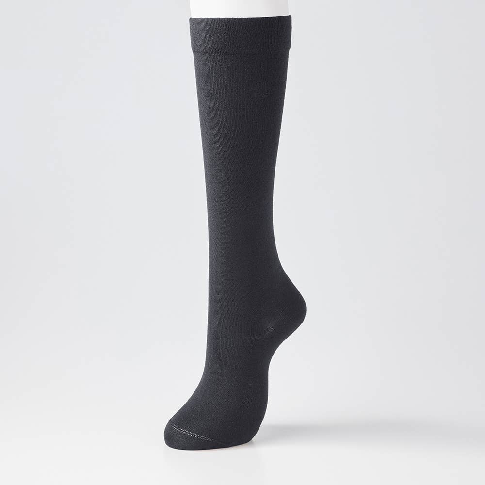 履きくちにゴム糸を使わないゆったり設計で、口跡が残りにくくやさしいフィットするハイソックス。