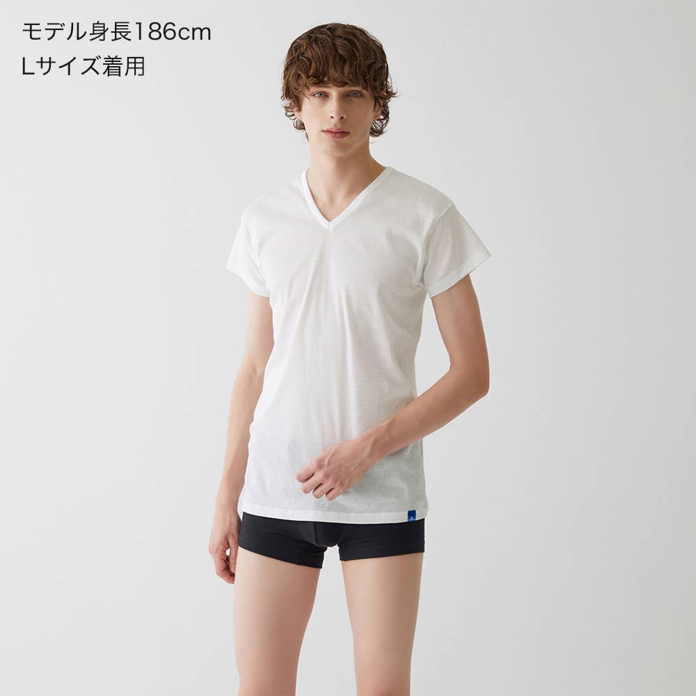 ・ポロシャツ等の襟元・袖から見えにくいVネック、袖丈短め仕様。