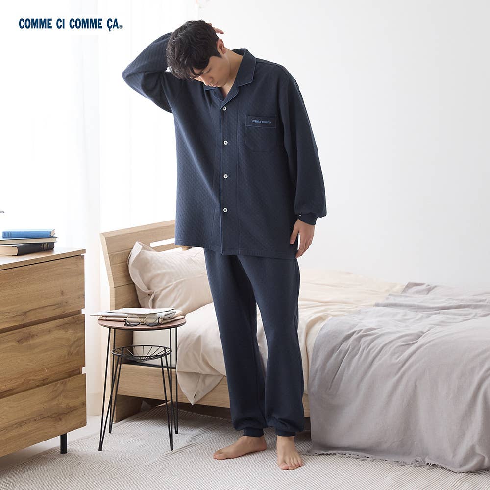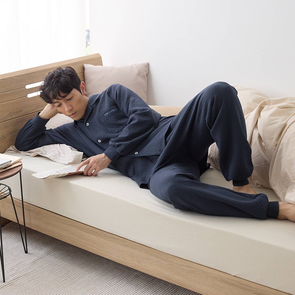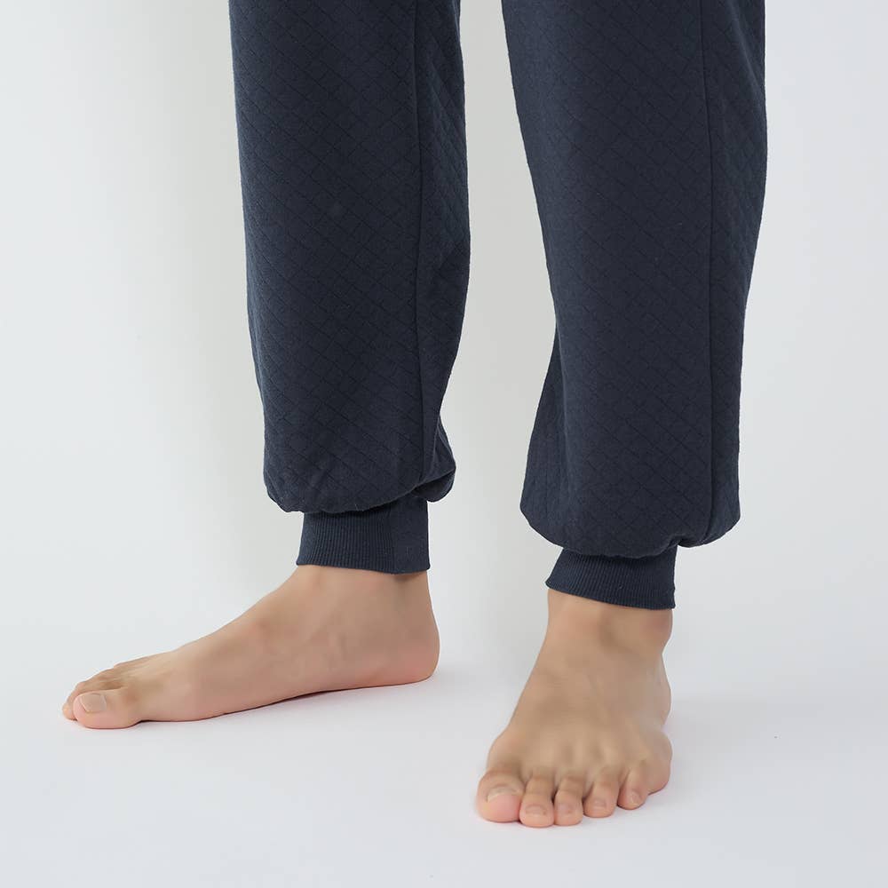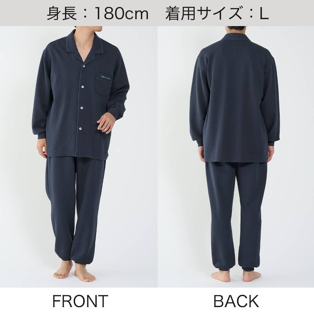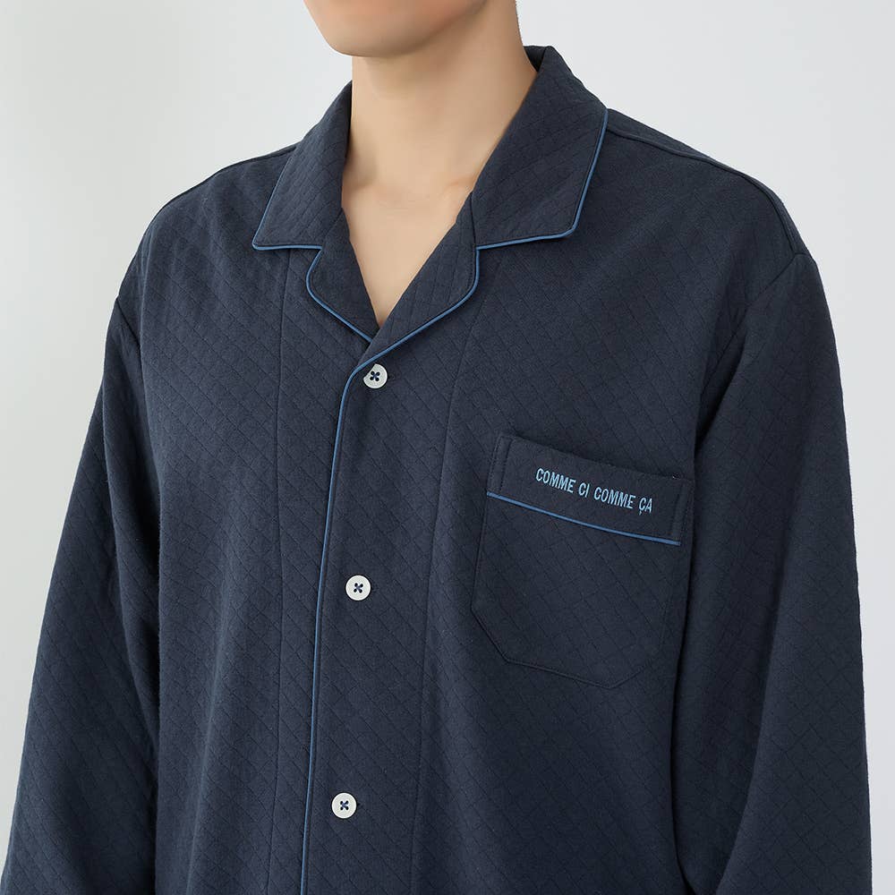 シンプルなテーラー襟で、袖口・足口リブ仕様のキルトパジャマです。