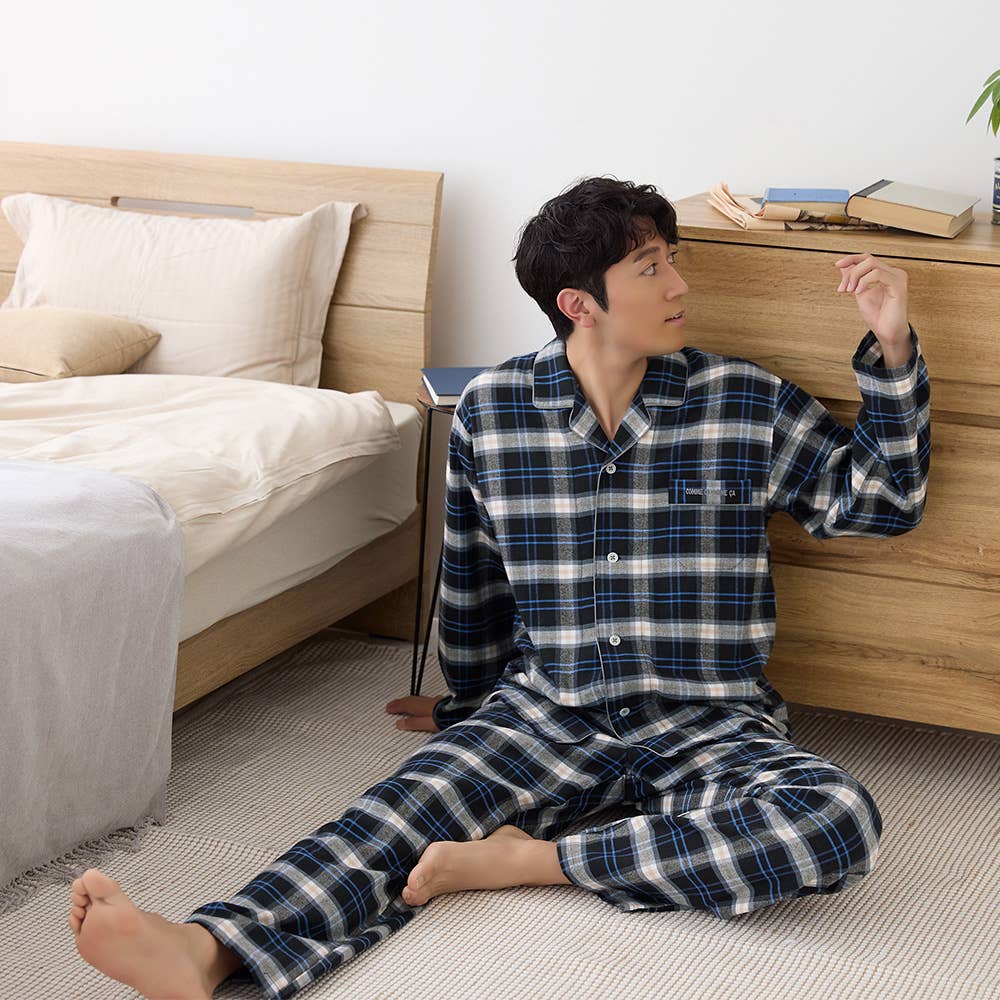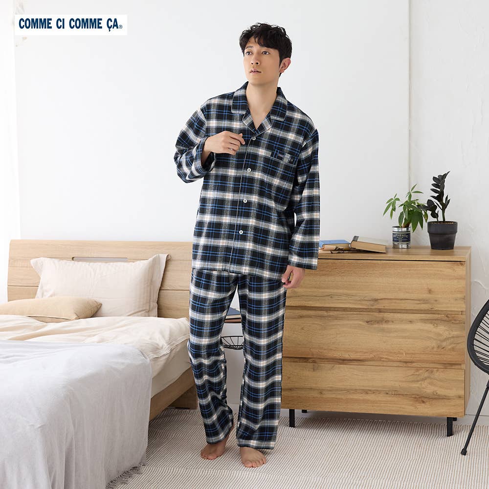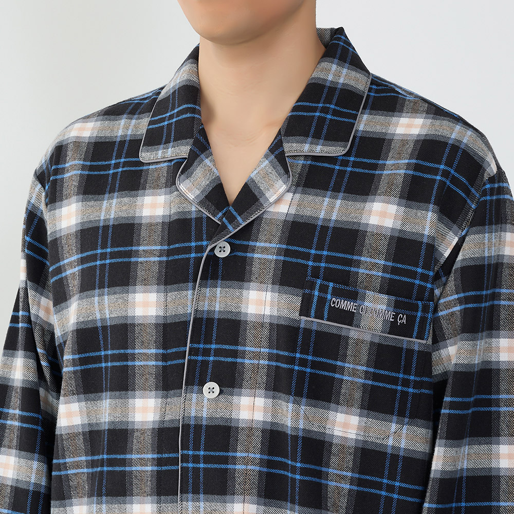 ・テーラー襟のパジャマで、ポケット口カフスのロゴ刺繍がアクセントとなっています。