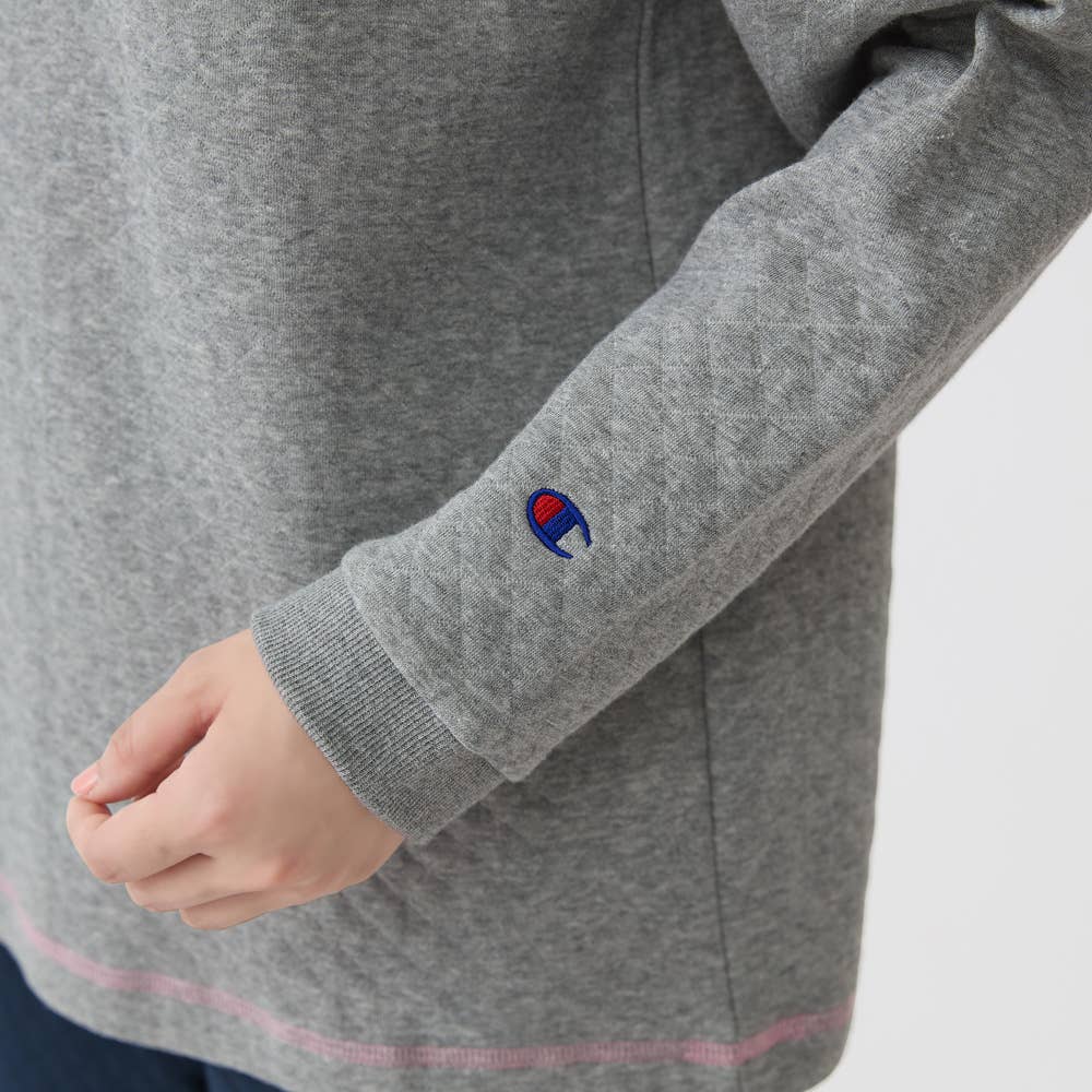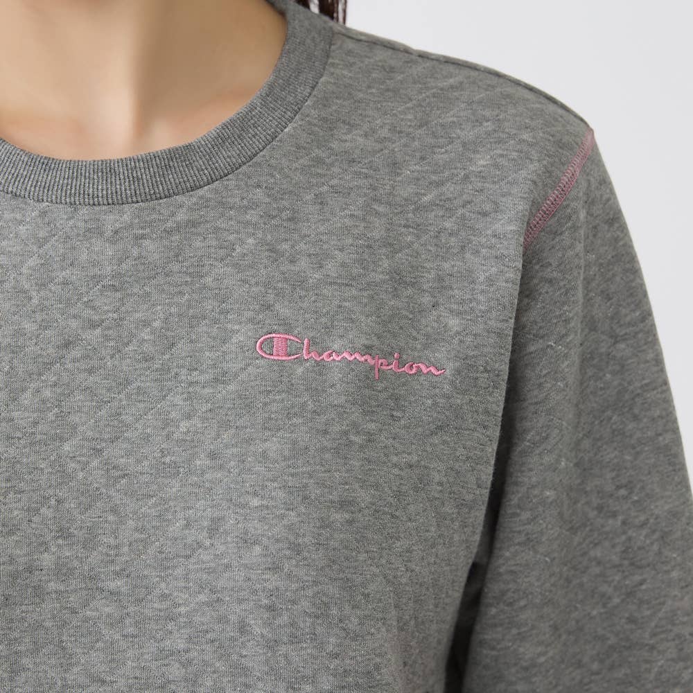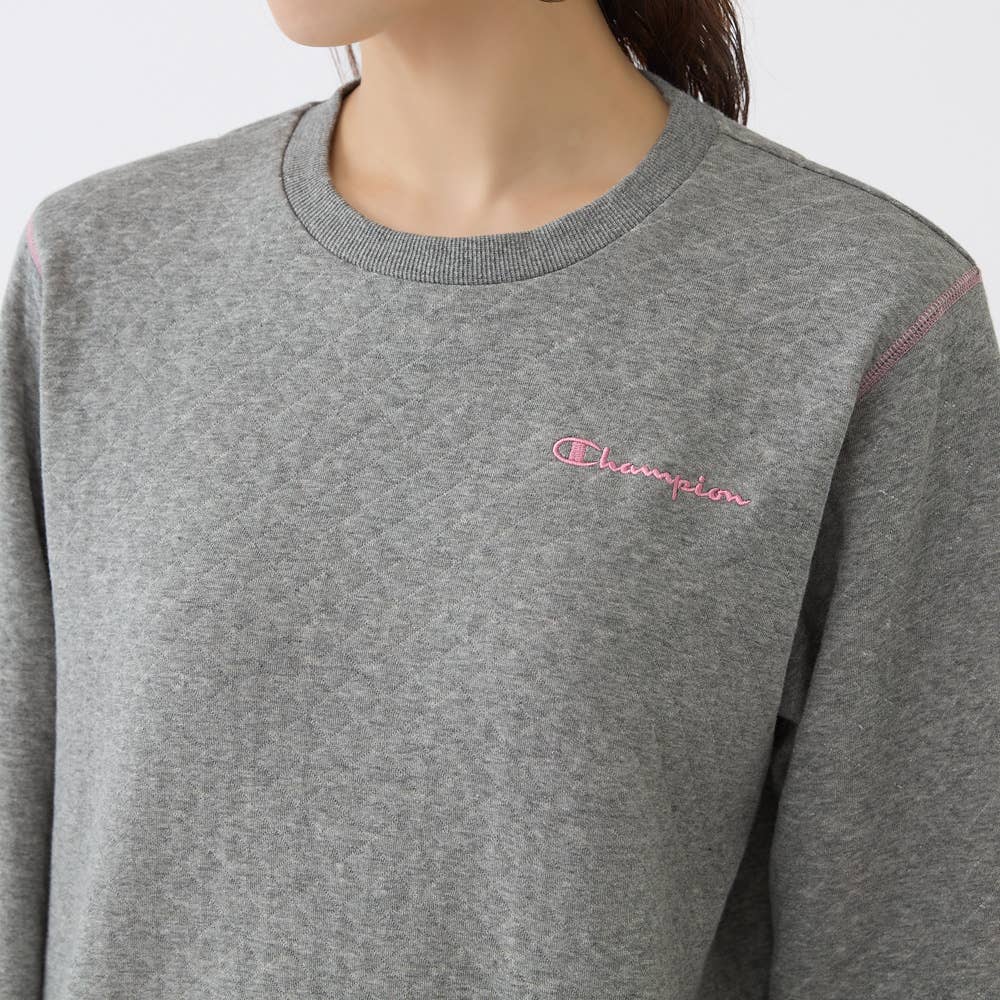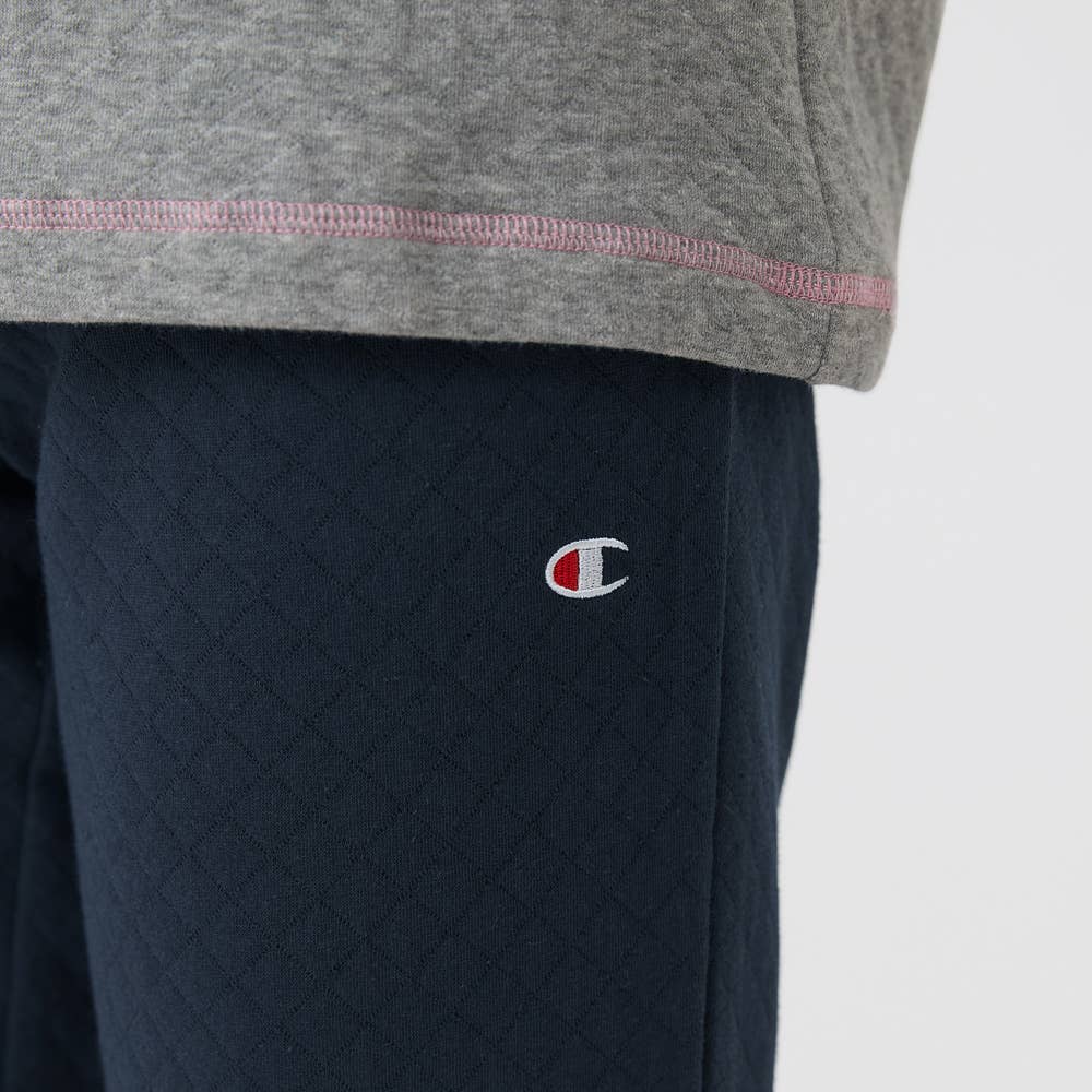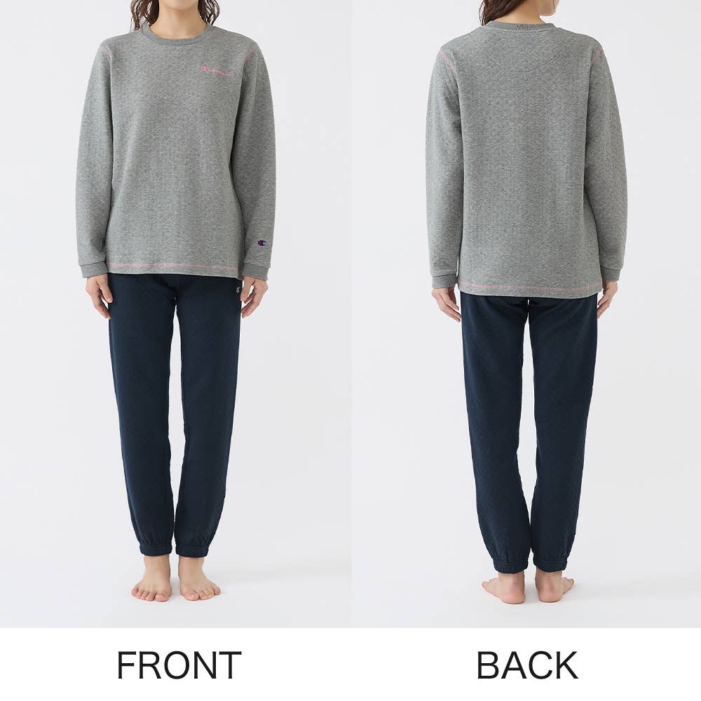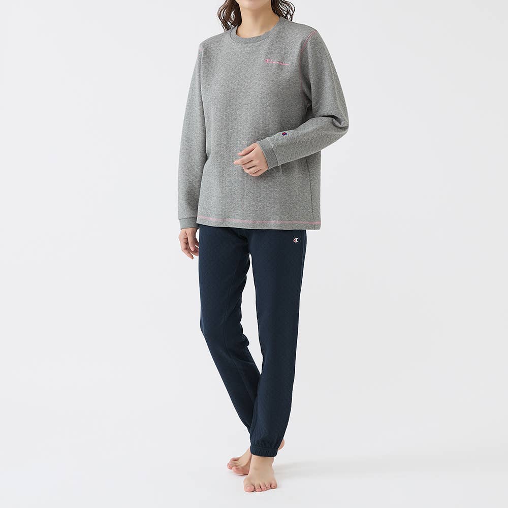 トップスにはChampionマーク、袖口とボトムにはCマークが施されたシンプルなデザインのルームウェアです。