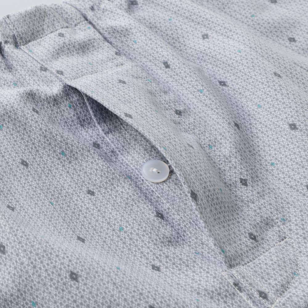 トップスは、丸首全開スタイルで、胸ポケットがついており、パンツはうれしい前あきタイプで、ポケット付きの便利で嬉しい仕様です。