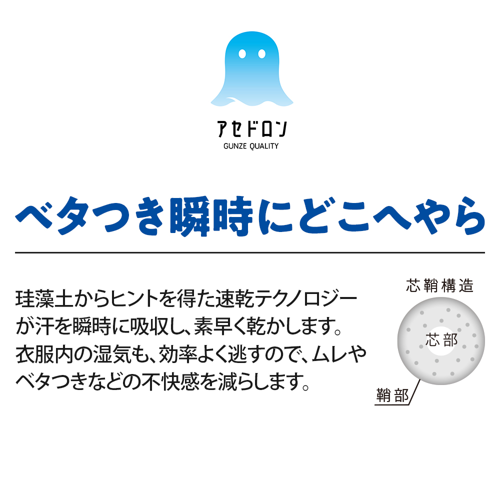 アセドロン独自の糸の構造で、汗を素早く吸収、拡散。洗濯後の乾きも早い!