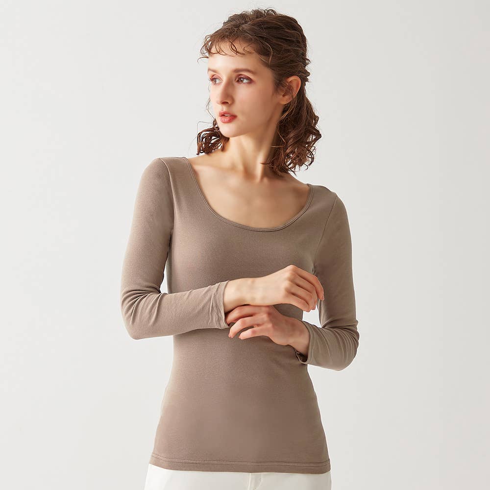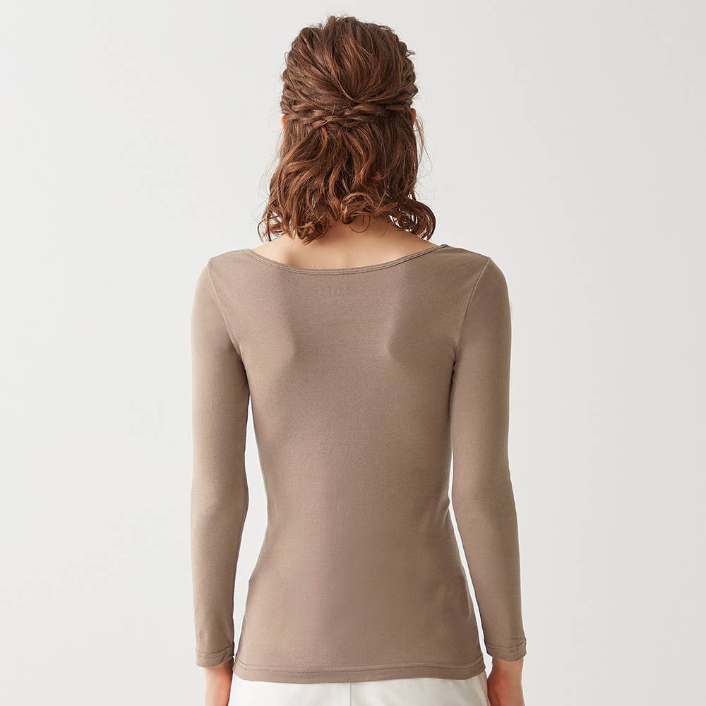 1年通して着用できる本体コットン100%素材の8分袖インナーは、ワードローブと相性の良いシンプルなシルエット。袖丈がすこし短めなので、アウターの袖から出にくくコーディネートしやすい長さです。身頃には脇はぎが無いので、ごろつきにくく、肌への刺激を軽減します。コットンのやさしい着心地をより実感できます。