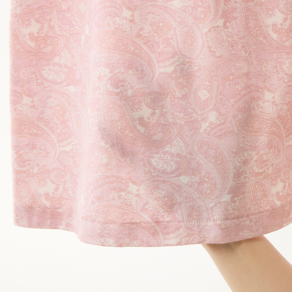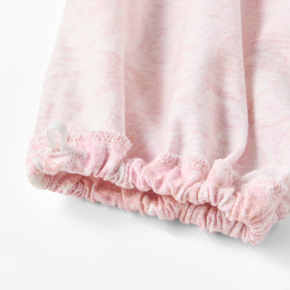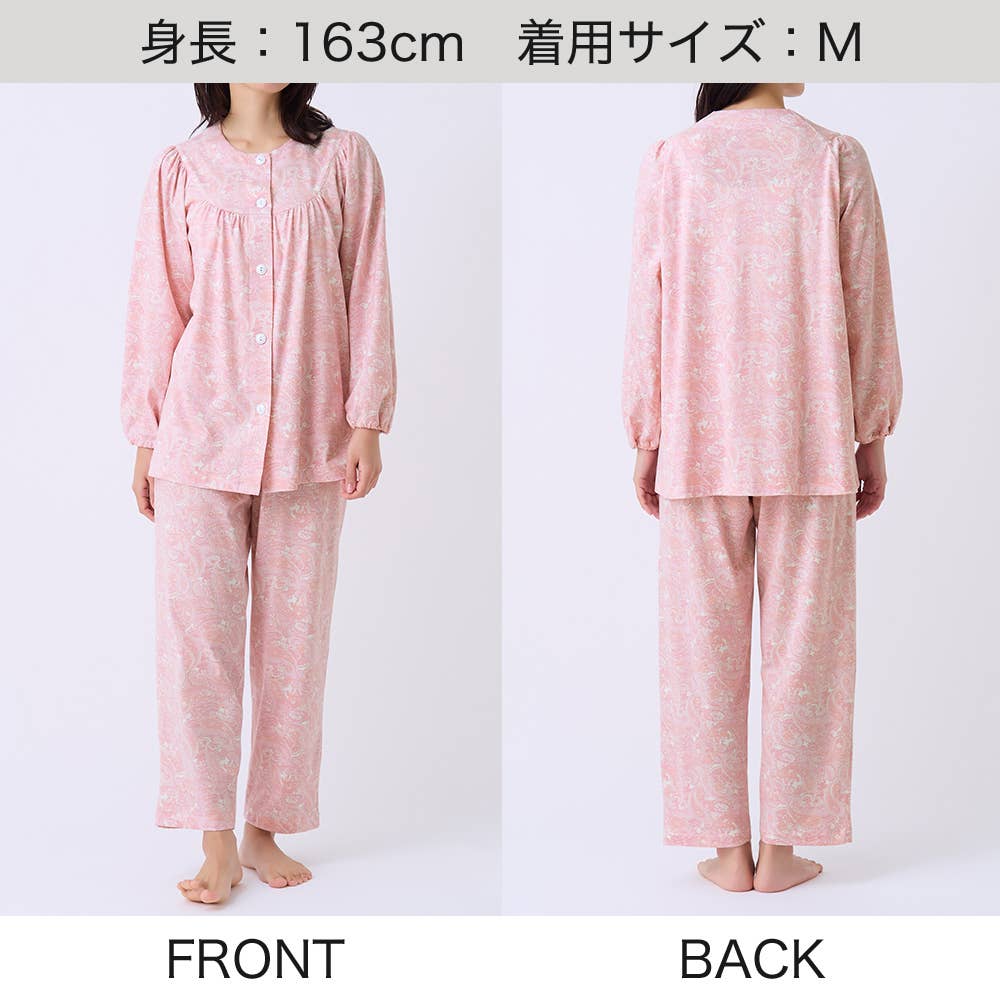 ベーシックなフェミニンタイプのパジャマで、袖口はゴム絞り仕様になっています。