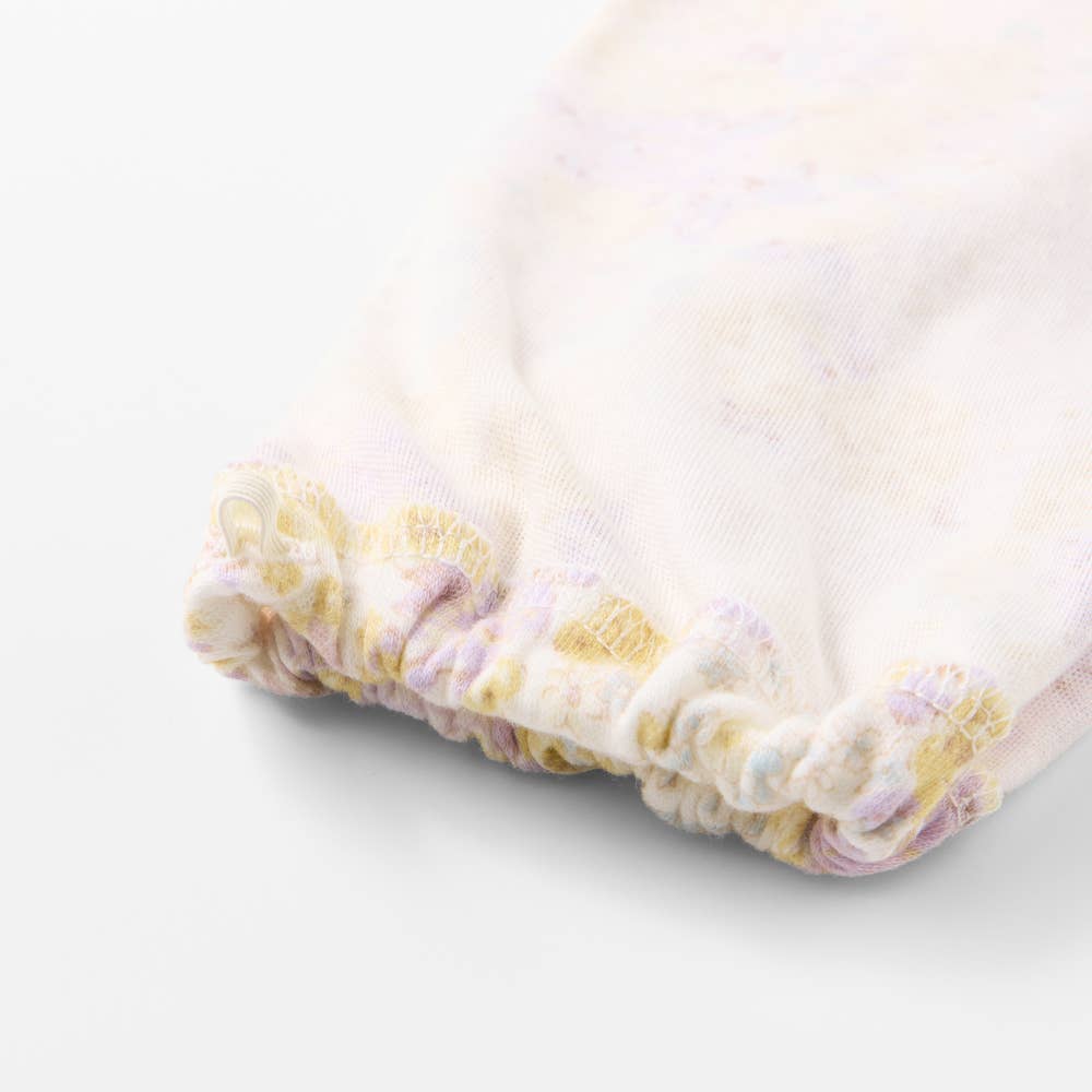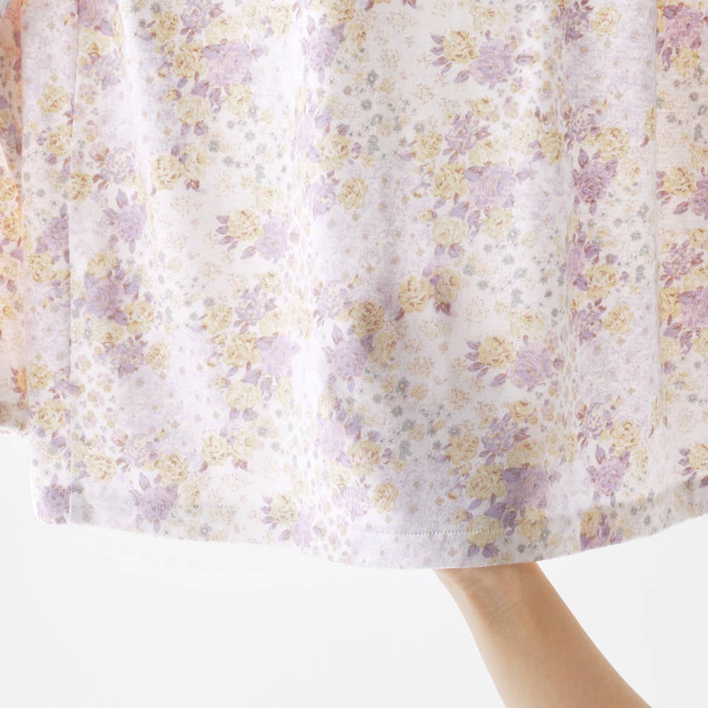 ベーシックなフェミニンタイプのパジャマで、袖口はゴム絞り仕様になっています。