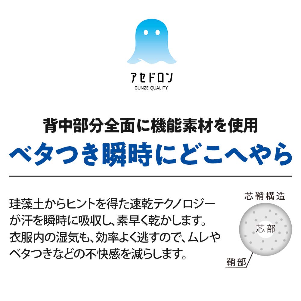 シリーズ累計出荷枚数 みなさまにご満足いただき話題沸騰の各賞獲得 グンゼ史上最高クラス。汗解消テクノロジー アセドロンならサッ・シュッ・パッと汗のお悩み・不安を解消! サッと吸湿 シュッと放湿 パッと速乾 だから、アセドロンはベタつき解消! いろんな所でアセドロンが大活躍