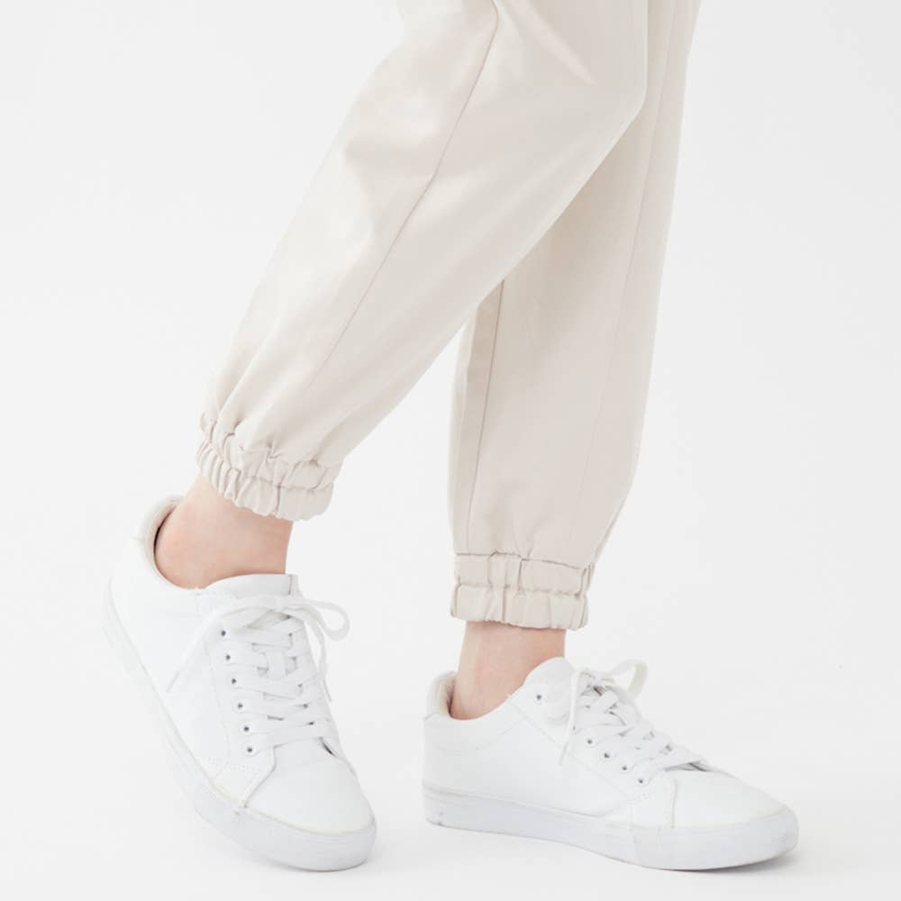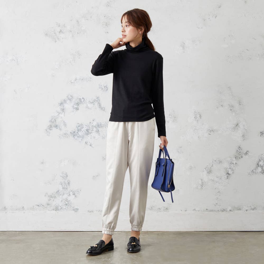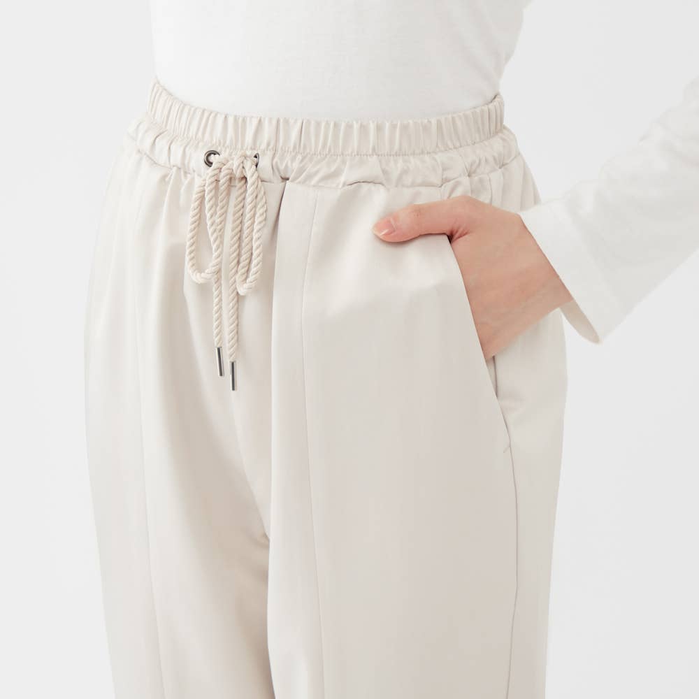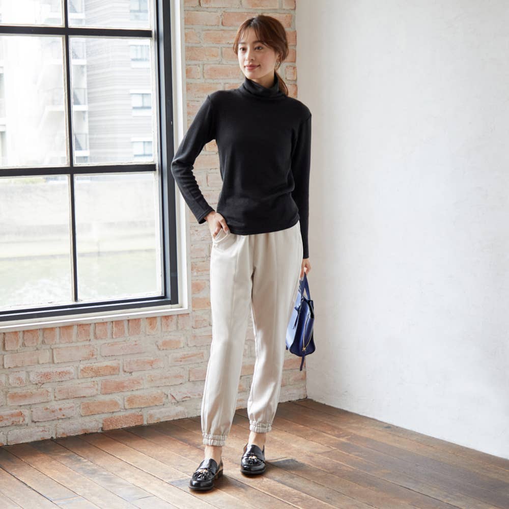 トレンドのジョガースタイル。裾はゴム付きで丈感を調節可能。動きやすく上品な見た目。