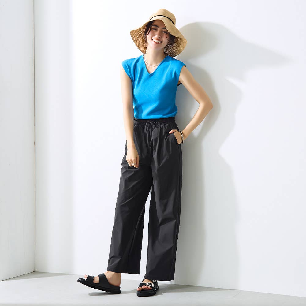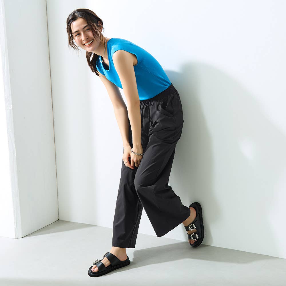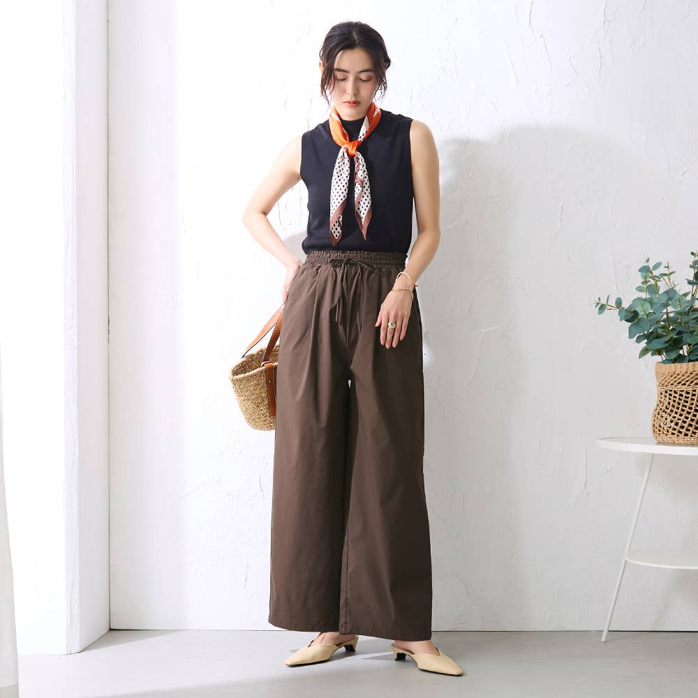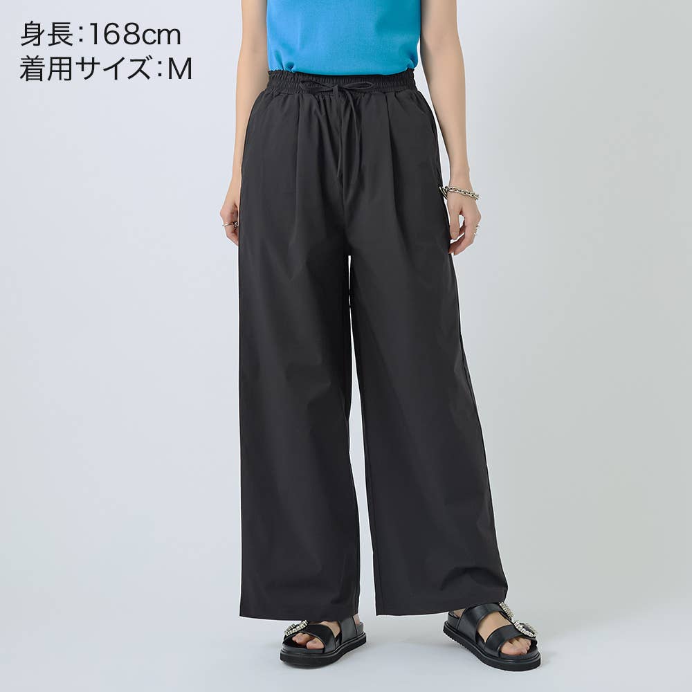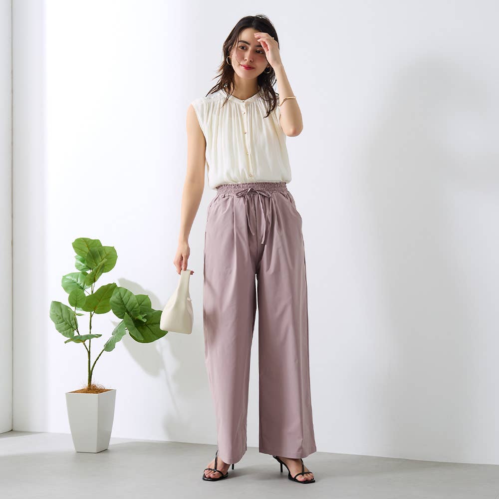 ・ウエストギャザー&タックありのワイドシルエットで体型カバー