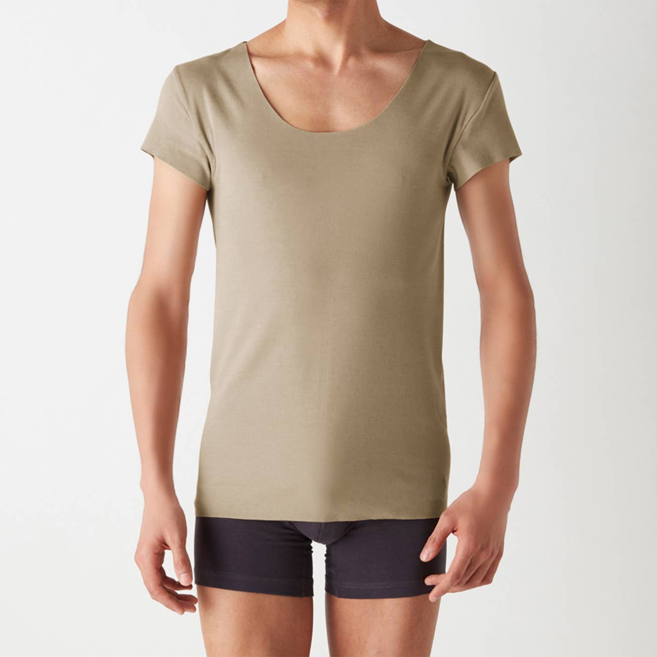 ネックラインは広めのラウンド、袖はTシャツやポロシャツより短めの設計で、衿元や袖口から下着がはみ出ることがありません。アウターのシルエットを邪魔しない計算されたコンパクトさです。