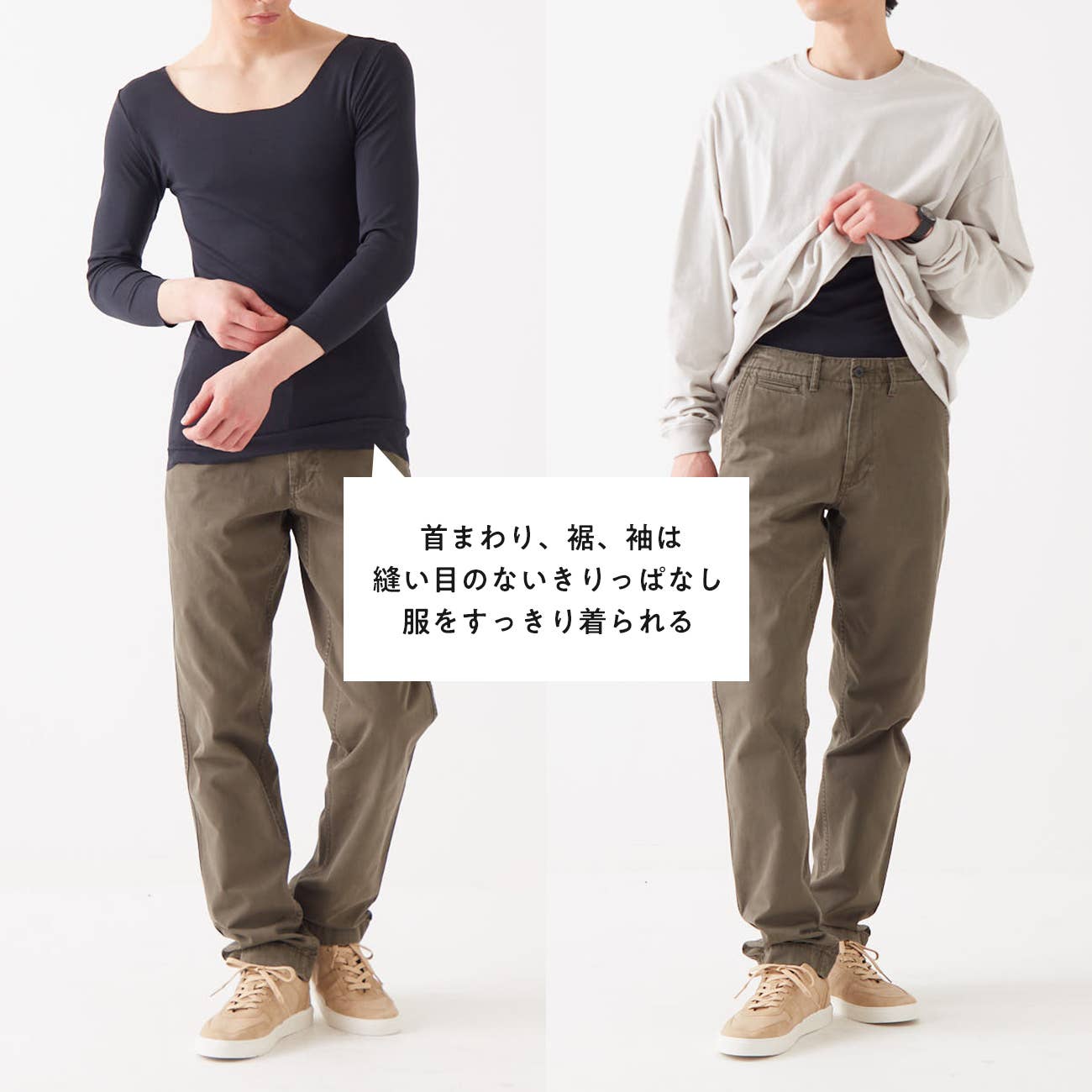 衿、袖、裾に縫い目がない、カットオフ仕様。また首の後ろにタグもなく、生地も滑らかなので外見はもちろん、インナーを着ていることを忘れてしまうほどです。