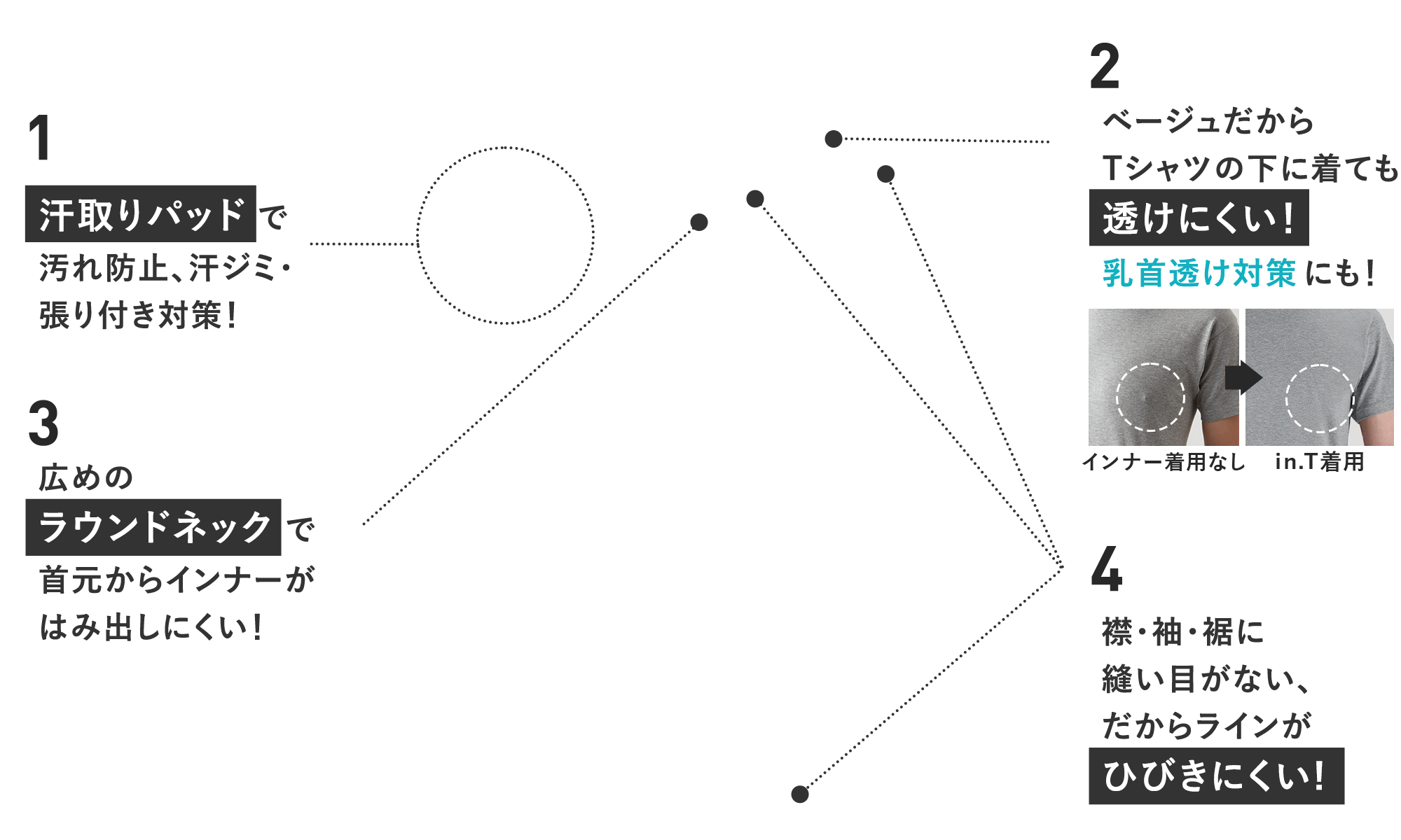 Tシャツの首元や袖口からインナーがのぞかないよう計算されたカッティング。in.Tの代名詞とも言える定番タイプです。初めてin.Tを着てみるならぜひこちらを。