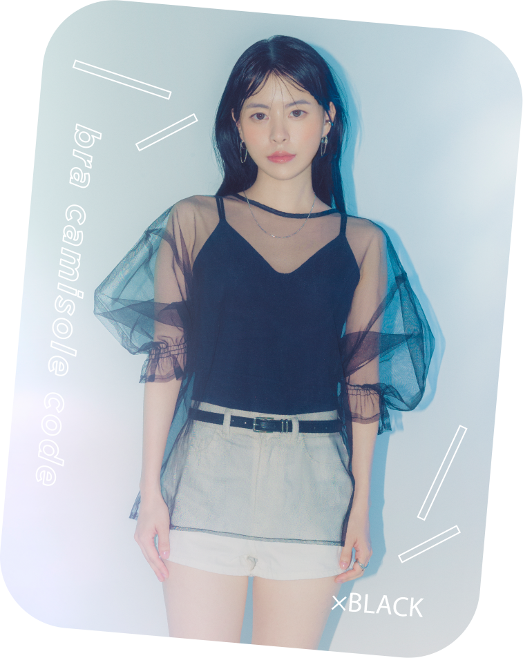 透けトップスには使いやすいブラキャミソールがおすすめ。深すぎないVラインなので