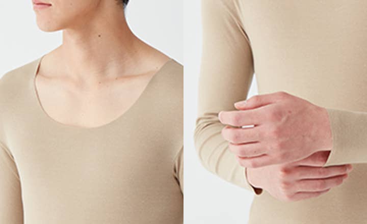 化学繊維のヒートインナーが苦手な方にもおすすめしたいやさしい綿の肌触り。普段使いにぴったりなカジュアルデザインで、デイリーユースに最適なあたたか低刺激インナーです。